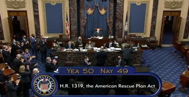 The American Rescue Plan passed on a 50-49 party-line vote with no Republicans voting for the bill. Alaskan Republican Senator Dan Sullivan left Washington D.C on Friday to attend his father-in-law’s funeral, so Vice President Kamala Harris was not needed to cast a tie-breaking vote.